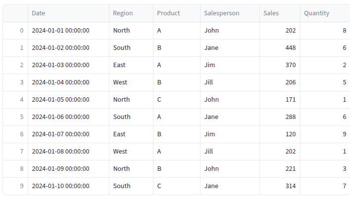 Let’s create a realistic sales transaction dataset that we’ll use throughout this tutorial. This represents 20 days of sales across different regions, products, and salespeople.