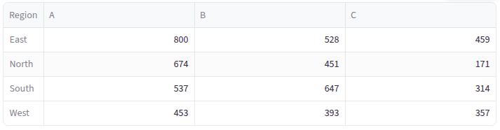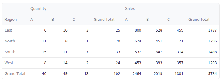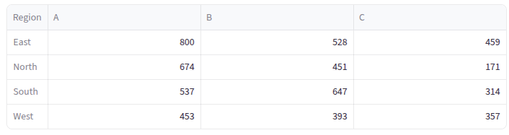 values='Sales': We’re aggregating the Sales columnindex='Region': Regions become our row labelscolumns='Product': Products become our column headersaggfunc='sum': We’re summing up all sales (could also be ‘mean’, ‘count’, ‘max’, etc.)
